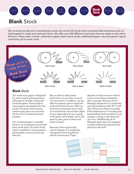 Riteway is a rapidly growing manufacturer of both printed and blank continuous and sheet fed forms. We can produce any form you need from start to finish: snap-outs, continuous forms, booklets, laser checks, labels, fan-a-parts, you name it. With both long- and short-run divisions we ensure that we are your one source for your business forms, all at competitive pricing.