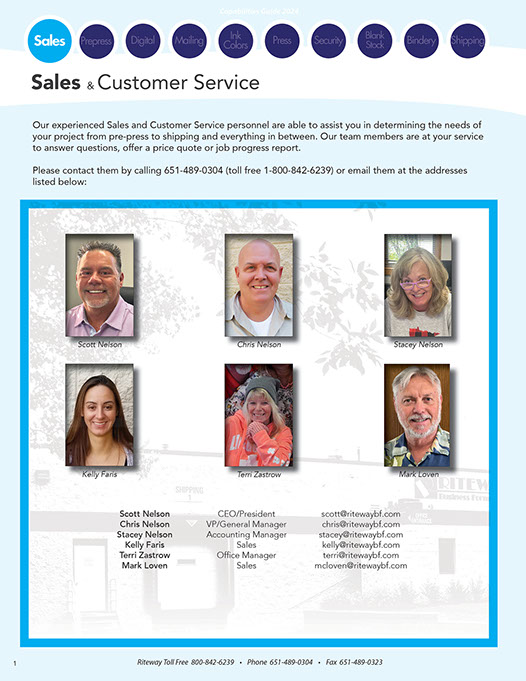 Our experienced Sales and Customer Service personnel are able to assist you in determining the needs of your project from pre-press to shipping and everything in between. Our team members are at your service to answer questions, offer a price quote or job progress report. Please contact them by calling 651-489-0304 or 1-800-842-6239 or email them at the addresses listed below:
